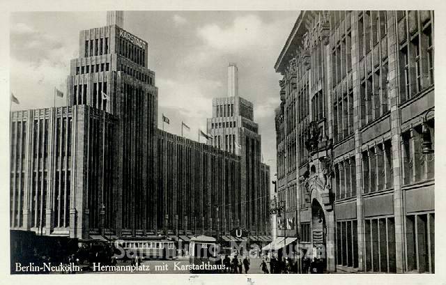 Blick aus der Hermannstraße auf das Warenhaus Karstadt am Hermannplatz. Das Geschäftshaus rechts an der Hermannstraße wurde 1908 nach Entwürfen von Arthur Vogdt an der Stelle des ehemaligen Rollkrugs errichtet. Es überstand den 2. Weltkrieg und steht seit 1987 unter Denkmalschutz.