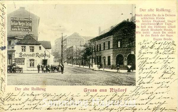 Blick vom Hermannplatz zur Hermannstraße. Links der Hermannstraße befindet sich noch der alte Rollkrug, rechts das seltener auf Fotographien zu sehende Accisehaus. Hier mußten bis 1874 Landwirte, die mit ihren Waren auf dem Weg nach Berlin waren, Zoll entrichten.