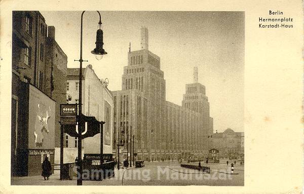 Blick aus der Hermannstraße auf dem Hermannplatz mit dem Karstadt-Haus. Im Vordergrund befindet sich der heute geschlossene U-Bahn-Zugang zum Südende des GN-Bahnsteiges (heute U8).