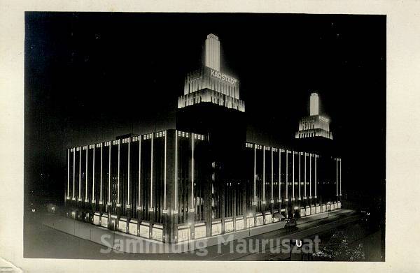 Nachtaufnahme des Karstadt-Warenhauses am Hermannplatz. Die Struktur der Fassade wurde bei Dunkelheit durch ein entsprechendes Belechtungskonzept wiederhergestellt.