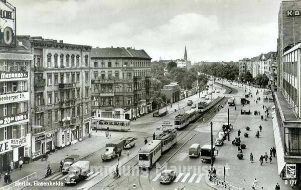 Blick vom Hermannplatz in die Straße Hasenheide. Am rechten Bildrand sieht man den Karstadt-Neubau von 1951, dahinter den einzigen erhaltenen Teil des Vorgängerbaus von 1929. Links biegt eine Straßenbahn in die Wissmannstraße ein. Weiter hinten steht das, später abgerissene, Portal zur "Neuen Welt". Im Hintergrund ragt der Turm der Kirche am Südstern in die Höhe.
