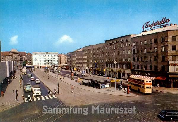 Der Hermannplatz in den 1970er Jahren. Die Straßenbahn verkehrt nicht mehr, der zentrale U-Bahn-Eingang hat einen neuen Zugang mit Dach und Rolltreppe bekommen und für die Fußgängerquerung wurden Ampeln installiert.