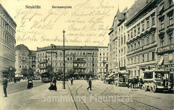 Blick von Süden auf die Mittelinsel des Hermannplatzes. Gut zu erkennen ist die großzügig dimensionierte Straßenbahnhaltestelle mit zwei Gleisen je Richtung. Am östlichen (auf der Karte rechten) Platzrand warten die für die damalige Zeit typischen Pferdeomnibusse auf ihren Einsatz.