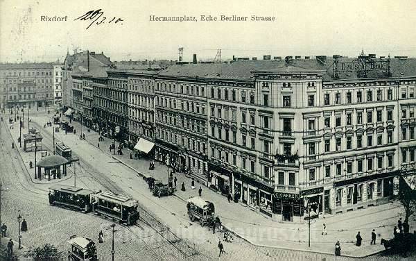 Blick von Süden aus der Bebauung Ecke Hermannstraße und Hasenheide, auf den Hermannplatz und die östliche (Rixdorfer) Bebauung. Erst kurze Zeit vor der Aufnahme wurde der Platz verbreitert. Hierfür wurden die Vorgärten vor den Häusern beseitigt und der Gehweg direkt vor die Häuser verlegt. Die neue Straßenpflasterung im Bereich des ehemaligen Bürgersteigs fällt noch deutlich durch die hellere Färbung auf.