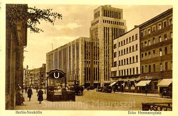 Blick aus der Berliner Straße (heute Karl-Marx-Straße) auf das südliche Ende des Hermannplatzes mit dem Warenhaus Karstadt. Im Vordergrund befindet sich ein Eingang zum östlichen Zwischengeschoß des U-Bahnsteiges der Nordsüdbahn (heute U7).