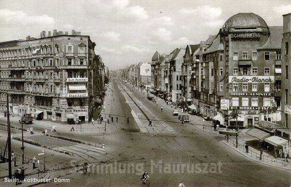 Blick vom Hermannplatz in den Kottbusser Damm, links biegt die Urbanstraße ab. Beide Straßen verfügen zu diesem Zeitpunkt noch über Straßenbahngleise.