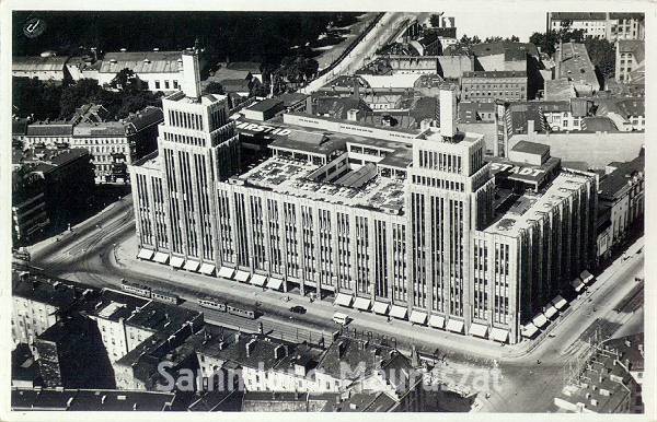Luftaufnahme des Hermannplatzes aus nordöstlicher Richtung auf die Hauptfront des Warenhauses Karstadt. Am oberen linken Bildrand ist der Beginn der Hasenhaeide mit der "Neuen Welt" zu sehen.