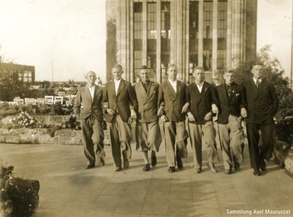 Eine Herrengruppe läßt sich am 16. September 1935 auf dem Dachgarten des Warenhauses Karstadt fotographieren.