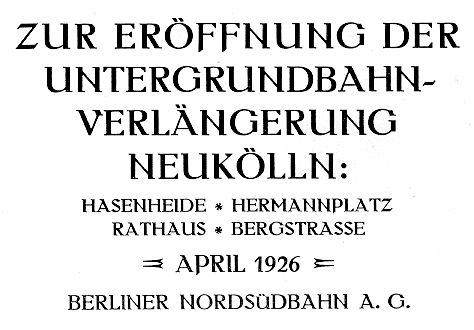 Mit der Inbetriebnahme der letztgenannten, 2,71 km langen Strecke Hasenheide - Bergstraße wird der dichtbevölkerte Stadtteil Neukölln endlich an das Schnellbahnnetz Berlins angeschlossen. - Die Betriebslänge der Nordsüdbahn vergrößert sich damit von 9,68 km auf 12,39 km.