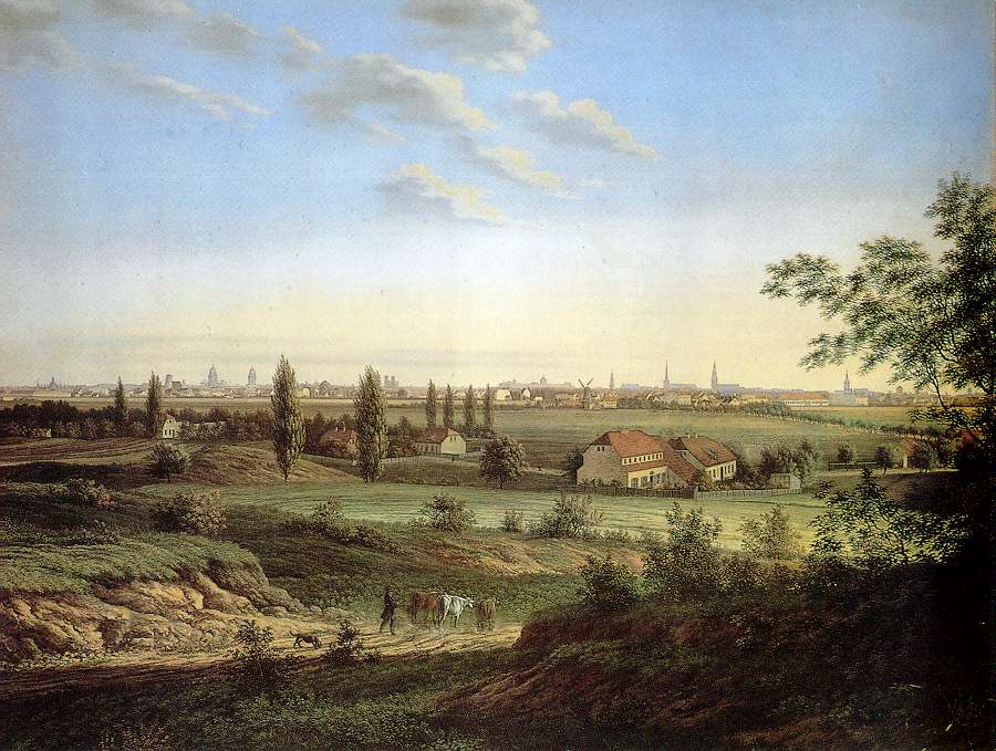 Blick aus den Rollbergen von 1834 über den Rollkrug, den späteren Hermannplatz und den Kottbusser Damm nach Berlin (Ausschnitt aus einem Gemälde von Wilhelm Barth).