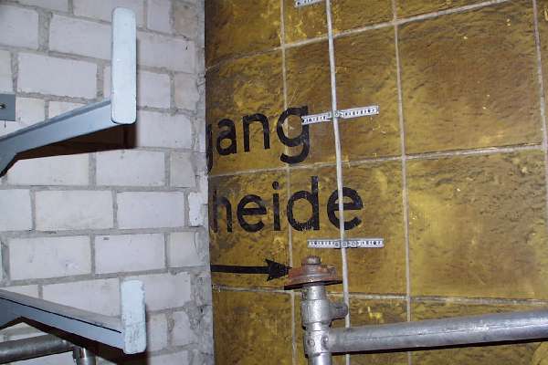 Die Wände des Ganges waren komplett mit den schimmernden sonnengelben Fliesen des Nordsüdbahnsteigs ausgekleidet. An der Südwand des Ganges sind diese großteils demontiert, an der Nordseite jedoch fast vollständig erhalten.